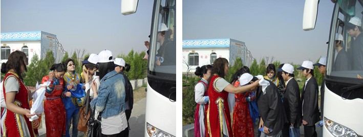 窩闊臺(tái)沙漠旅游景區(qū),迎接我們的是熱情的蒙古儀式下馬酒、敬獻(xiàn)哈達(dá)。在嘹亮的祝酒歌聲中所有員工都非常豪爽的干掉碗中的酒,由美麗大方的蒙古族姑娘獻(xiàn)上潔白的哈達(dá)。